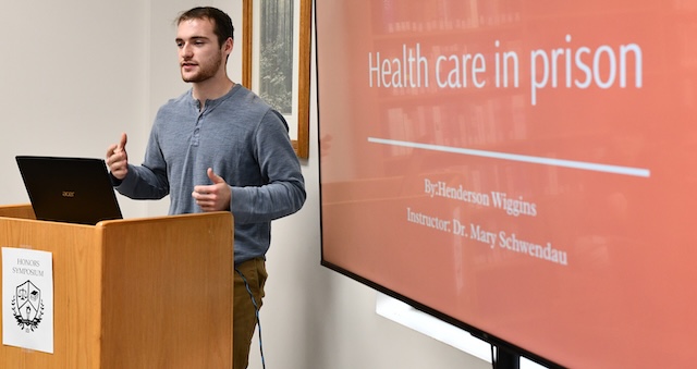 2025-11-26 - Columbia, KY - Photo courtesy Lindsey Wilson University. Lindsey Wilson University student Henderson Wiggins '28, a psychology major from Bowling Green, Kentucky, presents his research, "Health Care in Prison," at the 2025 fall symposium of the R.V. Bennett Honors Program, held Tuesday, November 25, 2025, in the Thomas D. Clark Reading Room of the Holloway Building.