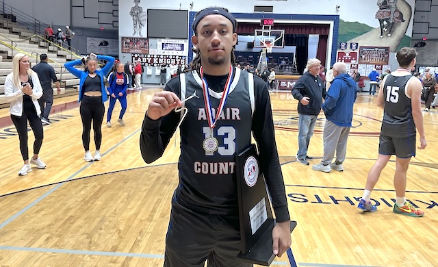 2026-01-10 - Lebanon, KY - Photo by Trey Stephens. Above, All Tournament team selection Tylin George with his peice of the net and the trophy, following the Indians 63-60 win over Taylor County in the in 2A4S Finals held at Marion County High School on Saturday, January 10, 2026. The Indians will move on to the 2A State Tournament in Owensboro next week.