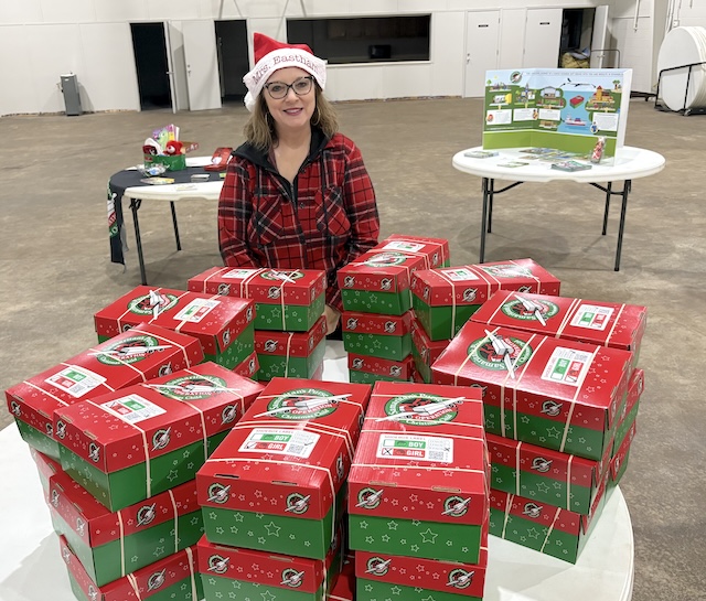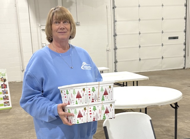 2025-11-17 - Columbia, KY - Photo from Mark Fudge. Diana Eastham made the first drop off of the 2025 OCC shoebox season. Diana is enjoying her first year of retirement from teaching and has spent much time in putting together beautiful shoebox gifts.