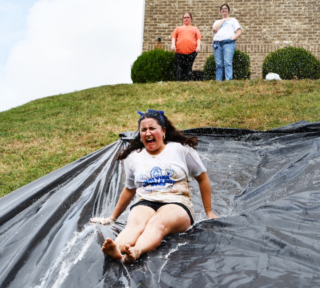 2025-09-25 - Columbia, KY - Photo courtesy Lindsey Wilson University. Lindsey Wilson University theatre and arts administration double major Sabrina Ruiz '26 of Louisville, Kentucky, braves the water slide set up on Keefe Hill during afternoon campus games and activities during Malvina Farkle Day 2025, held Wednesday, September 24, 2025.