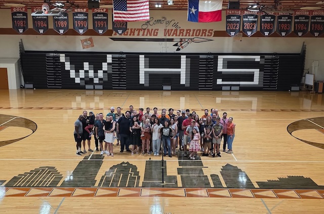 2025-09-25 - Austin, TX - Photo by Veronica Arnold. A group shot of families touring Westwood High School for Homecoming before the Class of 2025 20-year reunion. The floor design in the gym is the Austin Skyline. The Arnolds are in the front right section -look for the little girl in a sundress in the front.