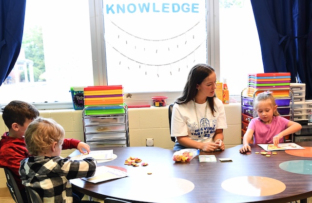 Lindsey Wilson University education major Sadie Kemp '26 of Columbia works with students at Adair County Primary Center during the university's annual Malvina Farkle Day on Wednesday, September 24, 2025.