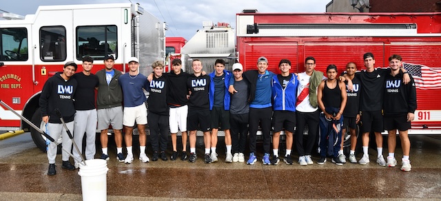 Members of the Lindsey Wilson University tennis teams helped wash a fire engine for the Columbia-Adair County Fire Department as part of their Malvina Farkle Day service project on Wednesday, September 24, 2025.