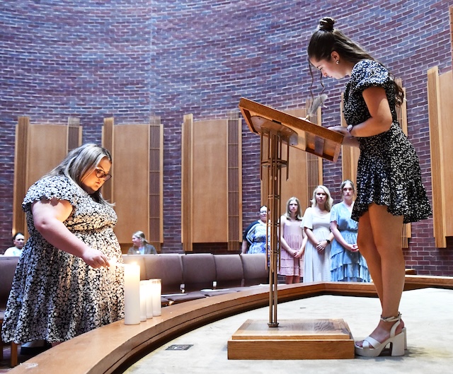 2025-09-24 - Columbia, KY - Photo courtesy Lindsey Wilson University. New Lindsey Wilson University Singer Gracie Thurman '29 of Owensboro, Kentucky, left, lights a candle while fellow new member Brinkley Todd '29 of Louisville, Kentucky, signs the group's "Standards of Excellence" on Tuesday, September 23, 2025, in the university's John B. Begley Chapel.