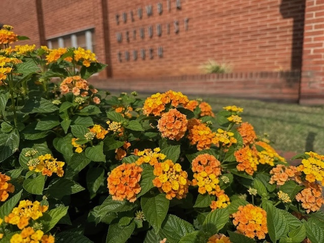 2025-09-24 - Downtown Columbia, KY - Photo by Linda Waggener, ColumbiaMagazine.com. Thanks to Sandra for loving care that keeps these Lantanas thriving at the entrance to Columbia United Methodist Church, 202 Burkesville Street, Columbia. She can also be found playing piano at the Sunday services, 10amCT, all welcome.