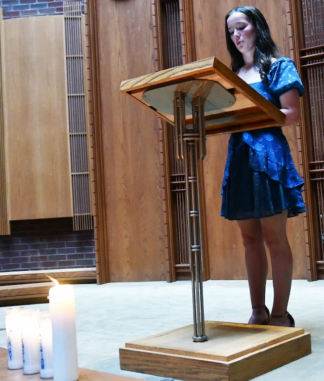 2025-09-24 - Columbia, KY - Photo courtesy Lindsey Wilson University. Lindsey Wilson University Singers officer Sadie Kemp '26 of Columbia speaks about the pillar passion -- one of the musical ensemble's three foundational pillars -- at the group's annual Standards of Excellence Signing Ceremony, held Tuesday, September 23, 2025, in the university's John B. Begley Chapel.