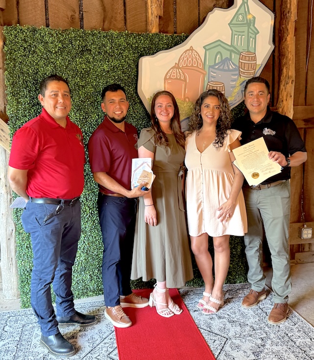 2025-08-08 - Columbia, KY - Photo by Linda Waggener, ColumbiaMagazine.com. The partners who are making three restaurants work in New Columbia gathered at the Chamber of Commerce Awards Banquet after being put in the spotlight by voters. Pictured From Left Are: Guadalupe Manjarrez, BYO Express; Erick Montoya, BYO Express, Black Stallion Steakhouse, and Happy Cow Cafe; Destiny Montoya, Happy Cow Cafe, BYO Express, and Black Stallion; Daisy Manjarrez, BYO Express, and Black Stallion; and Carlos Manjarrez, BYO Express, And Black Stallion Steakhouse.