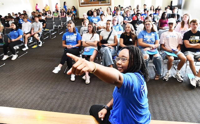 2025-08-09 - Columbia, KY - Photo courtesy Lindsey Wilson University. Student Success Counselor Jordan Nelson '22 shows new Lindsey Wilson University students gathered in a packed Norma and Glen Hodge Center for Discipleship how to register for the school's online services during the final Lindsey Wilson New Student Orientation of the summer on Friday, August 8, 2025.