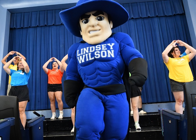 2025-08-09 - Columbia, KY - Photo courtesy Lindsey Wilson University. The new Blue Raider Bob mascot makes his first appearance at a Lindsey Wilson University event at the opening of the final New Student Orientation of the summer, held on Friday, August 8, 2025, in V.P. Henry Auditorium.
