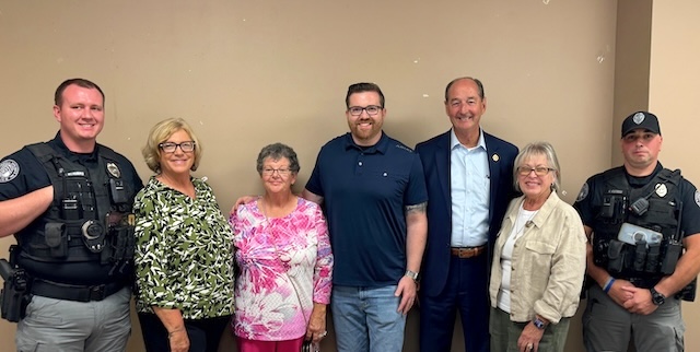 2025-09-23 - Russell Springs, KY - Photo by Linda Waggener, ColumbiaMagazine.com. A Democrat dinner meeting was held at the Community Center on Main Street in Russell Springs Monday evening to welcome Rocky Adkins, senior advisor to Governor Andy Beshear, along with Logan Forsythe former U.S. Secret Service agent and attorney, who announced his bid for Kentucky’s U.S. Senate. Pictured from left are: Russell Springs PD Officer Mason Miniard, Lou Ann Gore Flanagan, Vicky Pike, Forsythe, Adkins, Pam Shearer and Officer Kendall Catron.