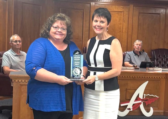 2025-09-23 - Columbia, KY - Photo from Adair County Schools. Adair Schools congratulates Jeana Pike, teacher at Adair County Elementary School, recognizing her as first ASCEND award winners at Thursday’s board meeting. Each month represents one of the district’s core values. August was acting with Integrity. Nominated by staff across the district. The nomination stated, “Mrs. Pike has helped numerous students believe in themselves and their ability to succeed. She creates a culture of integrity in her classroom. Her demonstration of integrity serves as a model to students, shaping their character in a positive way and preparing them for success in their futures.”