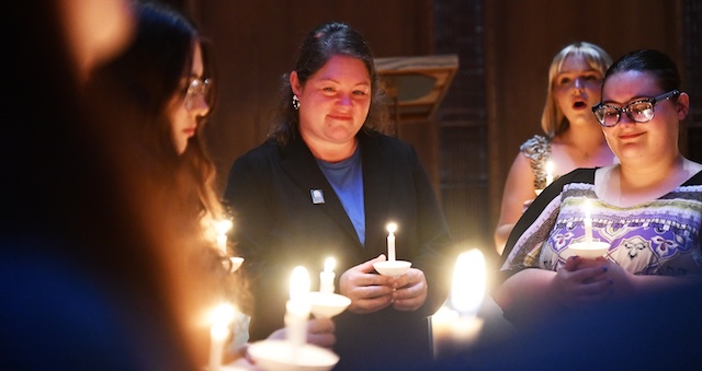 2025-09-24 - Columbia, KY - Photo courtesy Lindsey Wilson University. Lindsey Wilson University Director of Choral Activities Jennifer Bersaglia is welcomed into the Lindsey Wilson Singers at the group's annual Standards of Excellence Signing Ceremony, held Tuesday, September 23, 2025, in the university's John B. Begley Chapel.