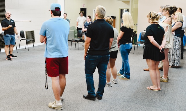 2025-08-06 - Columbia, KY - Photo courtesy Lindsey Wilson University. Lindsey Wilson University Director of Bands Robert Palmer addresses students, faculty and community members at an August 1 reception at the Blue Raider Band Building.