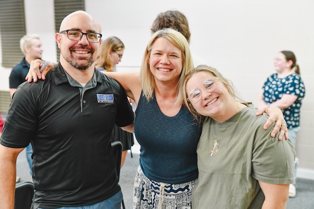 2025-08-06 - Columbia, KY - Photo courtesy Lindsey Wilson University. Lindsey Wilson University Director of Bands Robert Palmer is joined by Lindsey Wilson Dean of Arts & Humanities Allison Smith, center, and Blue Raider Band captain Chloe Taylor '26 of Columbia at the August 1, 2025, reception at the Blue Raider Band Building.