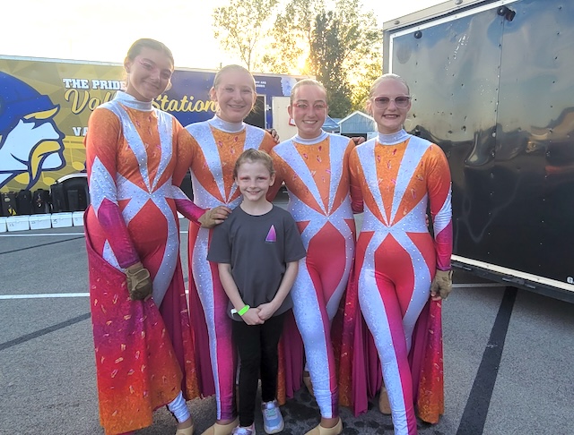 2025-09-17 - Larue Co., KY - Photo by Amber Hobaugh. Adair Color Guard members Charlie Whitaker, Alyssa Stearns, Bailey Huckaby and Ava Bryant pose with a young fan (Ember Hobaugh) ahead of the evening's Finals performance at the Lincoln Invitational on Saturday, September 13, 2025.