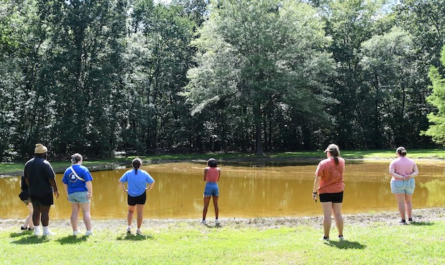 2025-07-27 - Shiloh, TN - Photo courtesy Lindsey Wilson University. Members of the cast of the Lindsey Wilson University TheatreFest! production of "Shiloh Rules" observe the Bloody Pond on Saturday, July 26, 2025, at Shiloh National Military Park. A shallow pool of water, Bloody Pond earned its name from the wounded soldiers and horses who sought relief there on the first day of the April 6-7, 1862, Civil War battle.
