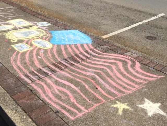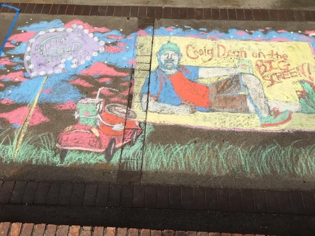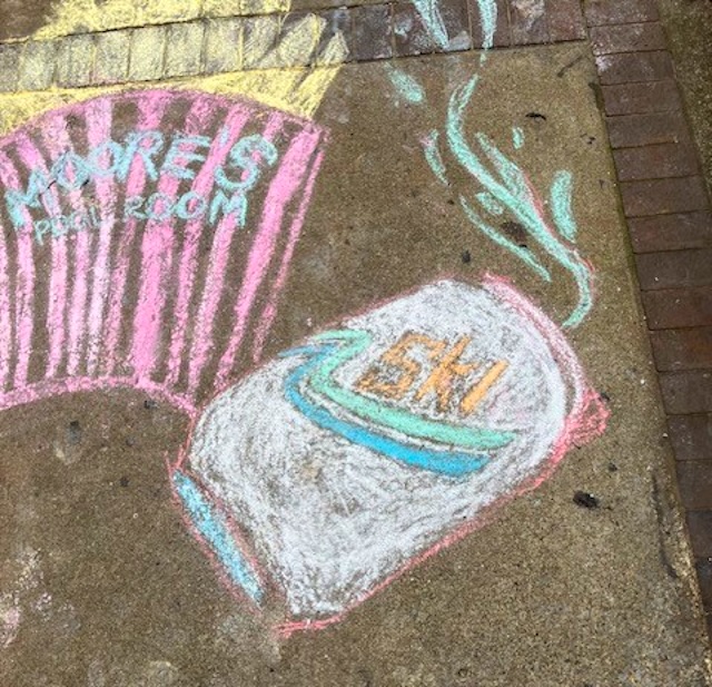 More of the chalk art by Serena Corbin for Paint the Town 2025. Serena came out very early in the morning to artistically represent Synergy and a special in front of Moore's Pool Room emphasizing "Best burger in town", SKI, and Lance Burton, world famous magician!