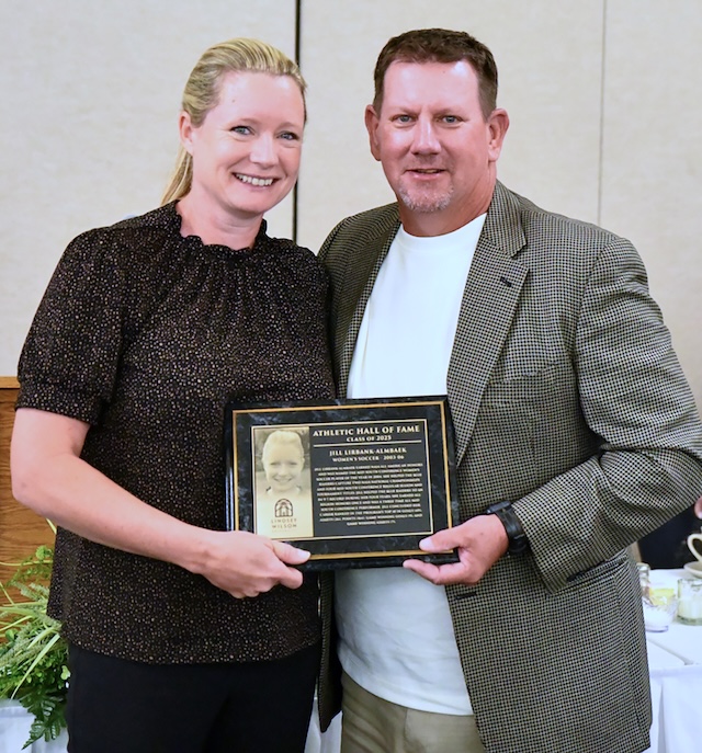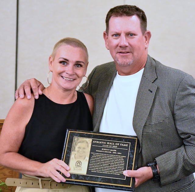 Lindsey Wilson University women's soccer coach Drew Burwash '94 welcomes his former player Jill Lirbank-Almbaek Fitzgerald '06 into the LWU Athletics Hall of Fame during the induction ceremony, held Saturday, Sept. 13, at Robert D. Cranmer Dining & Conference Center. Burwash was inducted into the Hall of Fame in 2004.