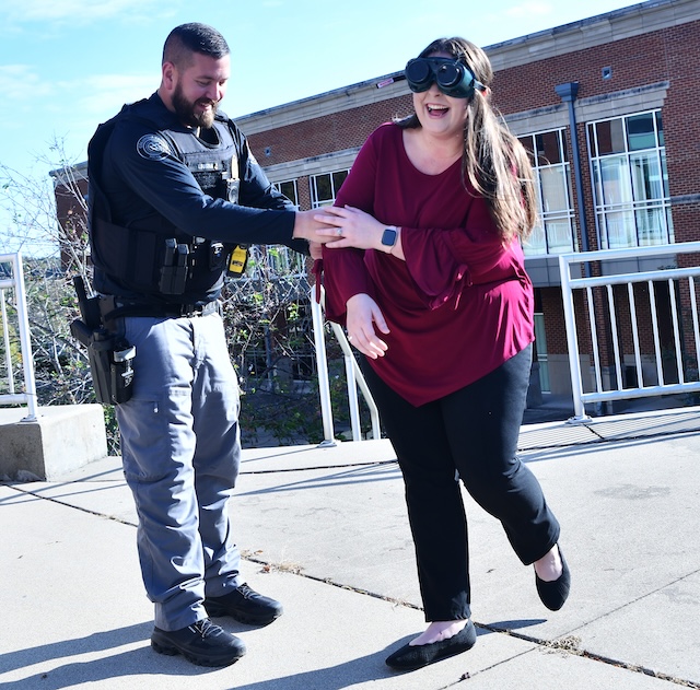 2025-10-17 - Columbia, KY - Photo courtesy Lindsey Wilson University. Lindsey Wilson University human services and counseling instructor Mahalia Cain is helped by Columbia Police Sgt. Trevor Foster while she wears a pair of alcohol-impairment simulation goggles during a "Substance Abuse" class on Thursday, October 16, 2025.