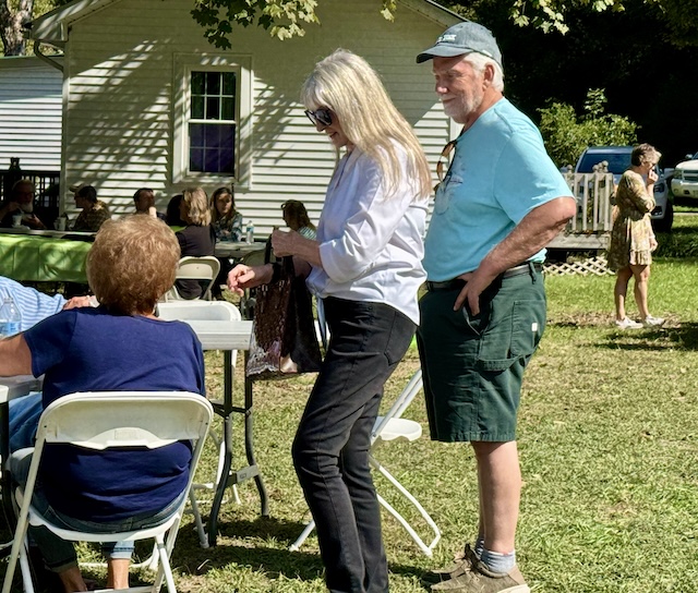 2025-10-06 - Adair County, KY - Photo by Linda Waggener, ColumbiaMagazine.com. Ken and Lynda Wilkerson stopped for visits at one of the booths on the grounds of the Janice Holt and Henry Giles log cabin and lake at the October 4, 2025 Festival. Ken especially wanted to attend because he grew up in the Knifley area.