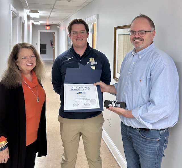 2025-10-06 - Columbia, KY - Photo from Trey Stephens. John Buchanan, Community & Economic Advisor for Kentucky League of Cities, presented City Clerk Woody Sharpe with a Level II Excellence in City Governance certificate from KLC's City Officials Training Center during his visit to Columbia City Hall on Monday, October 6, 2025.