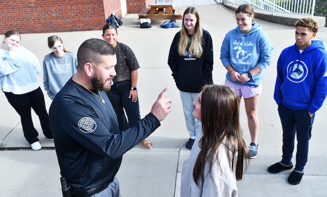 2025-10-17 - Columbia, KY - Photo courtesy Lindsey Wilson University. Columbia Police Sgt. Trevor Foster administers a field sobriety test to Lindsey Wilson University student Madison Cole '27 of Columbia during a "Substance Abuse" class on Thursday, October 16, 2025.