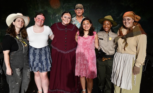 The cast pictured, from left: Shiane Lussier '26 of Bremen, Kentucky (Widow Beckwith); Zoe Boatright '28 of Columbia (LucyGale Scruggs); Kassidy Phelps of Burkesville, Kentucky (Miss Clara May Abbott); director and theatre professor Robert Brock; Sabrina Ruiz '26 of Louisville, Kentucky (Meg Barton); Mayatu Brown '27 of Columbia (Ranger Wilson); and Kayla Koerner '24 of Columbia (Mrs. Cecilia Delaunay Pettison).