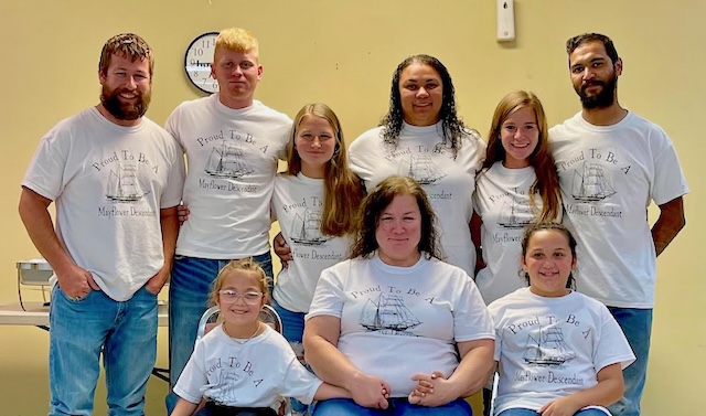 2025-12-30 - Columbia, KY - Photo from family collection. Annita Dial, seated in front, presented research tracing her family lineage more than 400 years back to Mayflower passenger John Howland, the subject of the book, "The Boy Who Fell Off the Mayflower." She recommends that everyone take time to trace and discover their own family histories. She also introduced her granddaughter Lariat, who is learning family research alongside her. Annita's family is pictured wearing family t-shirts that include their verified lineage and will be worn by family members during all holiday gatherings. Back row (Annita’s children): Jordan Baker, Jaykob Lee, Kantlee Harvey, Jaireka Barnett Baldwin, Jenna Lee Gray, and Cameron Barnett. Front row: Annita, center, holding the hands of her grandchildren, Lariat Baker and Laramie Baldwin.