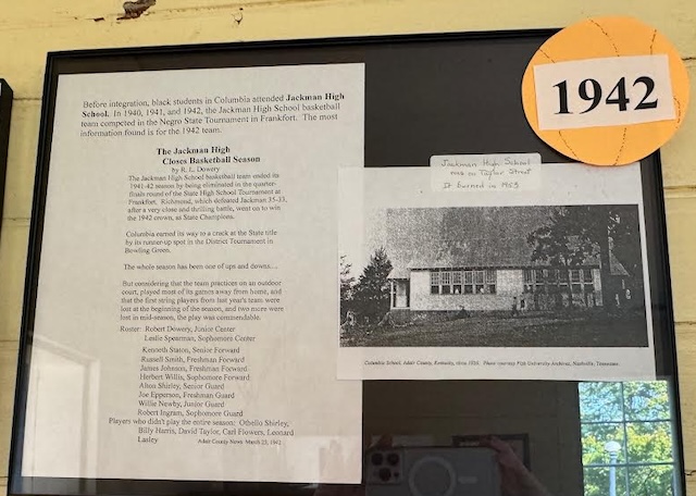 Students got to see information like this on their walk through the historic Trabue Russell House. Framed and hanging in the dining room, is this document about local school sports. Before integration, black students in Columbia attended Jackman High School. In the years 1940, 1941, and 1942, the Jackman High School Basketball team competed in the Negro Sate Tournament in Frankfort. The most information found is for the 1942 teams. Players names are listed. To arrange for a visit to the Trabue Russell House, contact the City of Columbia at 270-384-2501.