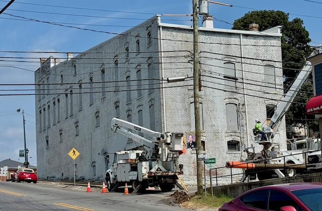 2025-08-21 - Downtown Columbia, KY - Photo by Linda Waggener, ColumbiaMagazine.com. Reed Street, a block off the Public Square in Columbia, has been closed from the Russell Building to Campbellsville Street for pole replacement and work on the power lines. Work is being done all around town so please travel with care.