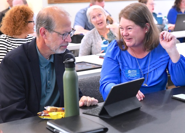 2025-08-22 - Columbia, KY - Photo courtesy Lindsey Wilson University. Lindsey Wilson University music professor and Choral Director Jennifer Bersaglia confers with music professor and Director of Church Relations Gerald Chafin during the university's opening faculty assembly Thursday, August 21, in the Norma and Glen Hodge Center for Discipleship. Fall classes begin August 25, 2025.