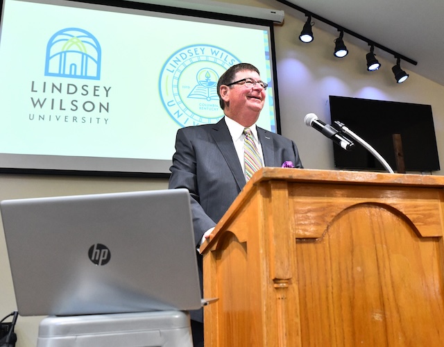 2025-08-22 - Columbia, KY - Photo courtesy Lindsey Wilson University. Lindsey Wilson University President William T. Luckey Jr. addresses the university's faculty Thursday, August 21, in the Norma and Glen Hodge Center for Discipleship and online during the faculty assembly to open the 2025-26 school year. Fall classes begin August 25, 2025.