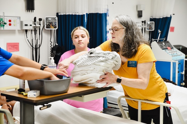 2025-08-20 - Columbia, KY - Photo courtesy Lindsey Wilson University. Lindsey Wilson University nursing student Madilyn Schultz of Elizabethtown, Kentucky, observes nursing professor Dr. Susan Vickous during nursing boot camp on Tuesday morning in the Dr. Robert and Carol Goodin Nursing & Counseling Center.