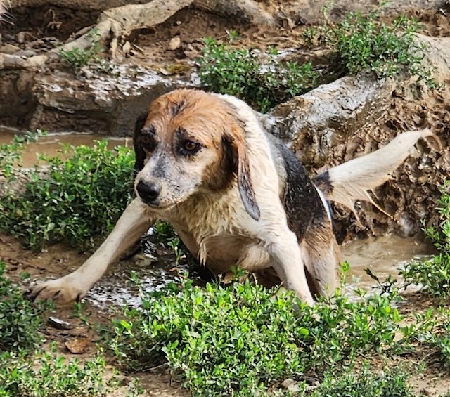 2025-08-20 - Adair Co., KY - Photo by Peg Schaeffer. Peg says that her beagle Remi finds pleasure digging holes and then when it rains, playing in them in the mud. "We could learn a lot from Remi. Despite her handicap, she makes the best of life. I love her so much. Her attitude and spirit are amazing."