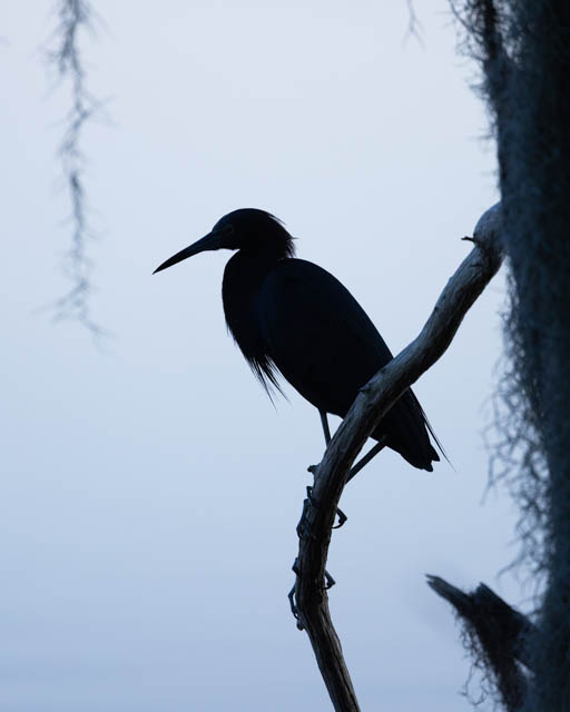 A little blue heron silhouetted against the waters of Lake Hancock along the hiking trails in the Circle B Bar Reserve. They live year-round in Florida and elsewhere along the Gulf and Atlantic Coast and South America, and are seen in Kentucky during migration.