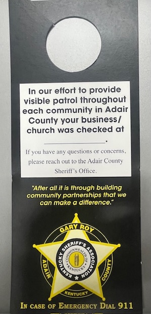 Door hangers like this one will mark Safety Checks by the Sheriff's Office at properties throughout Adair County.