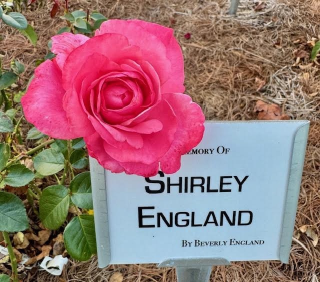 2025-10-01 - Columbia, KY - Photo by Linda Waggener, ColumbiaMagazine.com. The memory of Shirley England is honored by her daughter Beverly with this beautiful pink rose blooming in these early fall days in the Trabue Russell rose garden. To find out how to do this for family or friends, contact City Hall in Columbia at 270-384-2501.