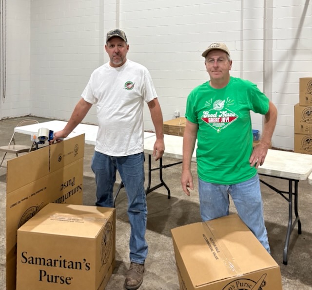 Mike Smith and Mark Young--both members of the Cane Valley Baptist Church--did much of the heavy lifting Wednesday night when it came to stacking the cartons field with shoebox gifts. The crew from Cane Valley Baptist Church volunteers at the Wheet Fellowship Hall every year.