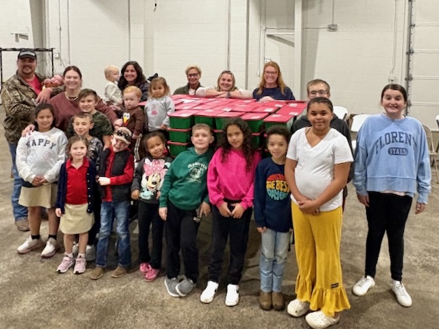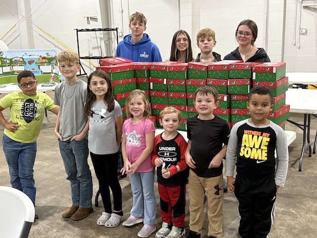 The children and youth from the Creekbend Community Church delivered shoebox gifts to the Wheet Fellowship Hall on Wednesday evening. Pictured are front row from left: Zavion Logsdon, Colton Irvin, Kailyn Irvin, Naom Spoon, Rhett Wood, Ezra Spoon, and Zekiah Hendricks. Standing from left are Bryson Hadley, Karlie Irvin, Caleb Robertson and Anna Beth Sharp.
