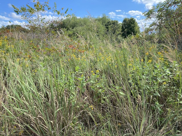 The yellow flowered plant in the lower middle of the front is Partridge Pea. The yellow just above it is Wingstem. Of course, the yellows, if you will, above and behind are our state flower, Goldenrod. And finally, the tall grass supporting heavy seed heads is the appropriately named, Yellow Indiangrass!