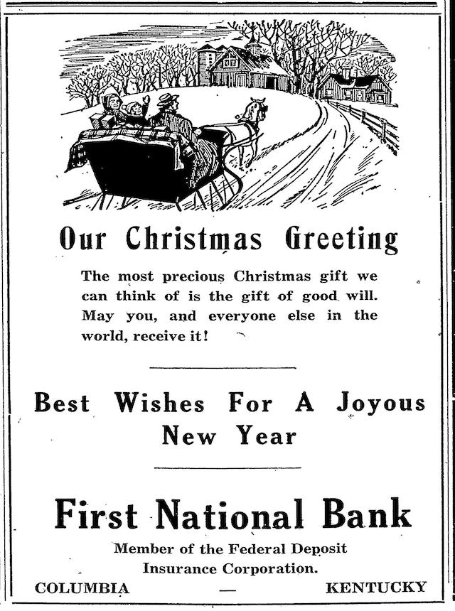 This vintage Christmas Greeting advertisement from the First National Bank appreared in the December 22, 1948, issue of the Adair County News.