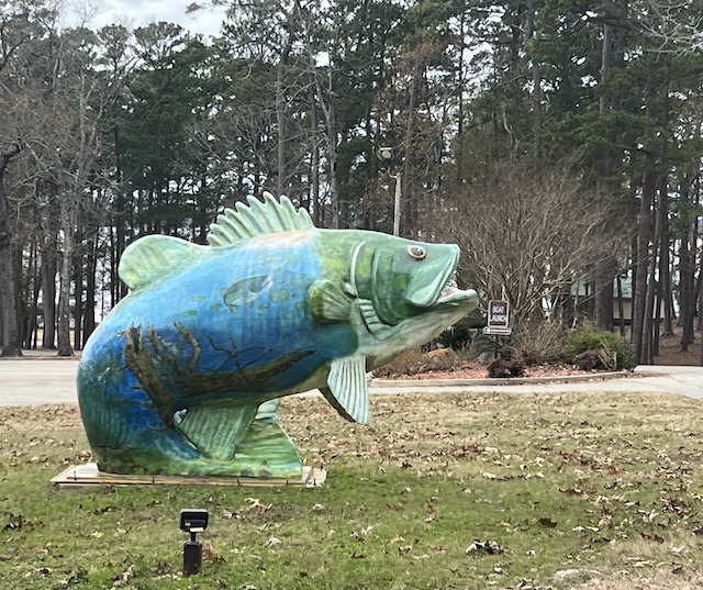 Sabine Parish in Louisiana is home to numerous Lunker Fish sculptures painted by local artists. This Lunker is located inside Cypress Bend Park & Marina, by the entrance of the large parking lot. It was sponsored by the Sabine River Authority, and painted by Janice Hutton.