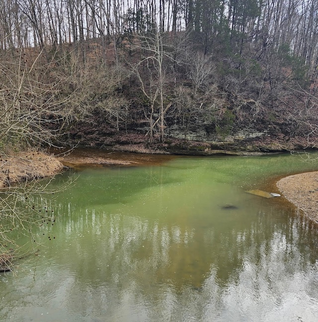 Clifty Creek Farm owner, Donna Rieder, sends this picture and asks, "What on Earth (or rather, what in Russell Creek) is THIS?? The water from Big Clifty Creek feeds into Russell Creek at what's called the "Sam Coffey Hole." The water normally runs clear, with a "rootbeer" kinda vibe. Russell Creek had this weird, opaque green water flowing this afternoon [Thursday, February 19, 2026]."
