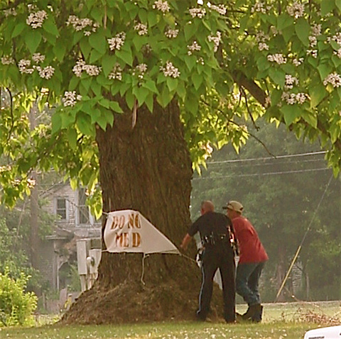 May-or, May-or, Do Not Cut Me Down. While all others thou art felling, Do Not Cut Me Down: A banner was affixed to the famous old Horse Cave Main Street and US 31-W Catalpa Tree last week.. The White Week of the Catalpa Tree is being celebrated by a lot of folks this week, and, a trio of Catalpa fanciers, Tom Chaney, Rob Stout, and Robert Stone think it's worth a trip to Tom Chaney's Bookstore this week to see it. Tom Chaney writes, to explain the photo, "Cannot identify either party in the picture. They were taking the banner down. This was taken Friday afternoon late after someone had put up the sign. The tree is flanked by the ruins of the Owens Hotel, the Gorin Store and three houses burned or destroyed under the direction of the mayor. I suppose someone thought the tree might be next."