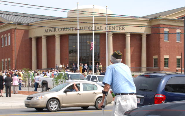An old soldier stands at attention as best he can during the presentation of the colors at the new Adair County Judicial Center dedication this morning. World War II veteran Edgar Holmes watched from across Campbellsville ST as the Adair County FFA presented the colors which just minutes earlier had flown over the historic Adair County Courthouse at 500 Public Square.