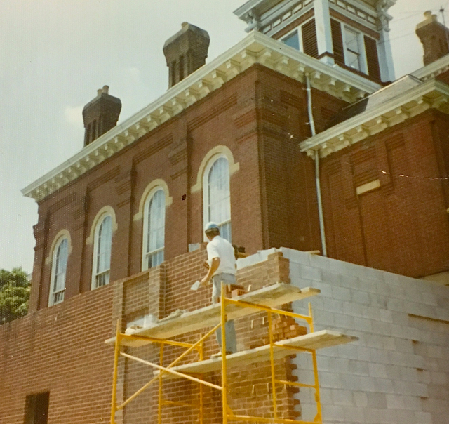 Over the years, as space was needed, two wings were added onto the historic Adair County Courthouse, changing the look and the yard space around the building. The wing being built in this photo faces Campbellsville Street. Preservationists discuss ways to safely remove the wings and return the building to its pre-1970s state. There are questions about the stability of the walls if the entire wings are removed. There has also been discussion of turning the wings into open-air porches for community use.