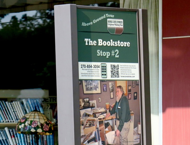 A discovery in Horse Cave - they've developed cell phone guided walking tours of their town which will definitely require a trip back when there's more time. We paused in front of The Bookstore and found it was closed for the day, but we learned from the sign in front of the store that read: "Horse Cave Stories Cellphone Walking Tour. The Bookstore, Stop #2. What makes this bookstore so unique is Tom Chaney, the owner. Call cell phone audio 270-854-3054 to learn about Horse Cave's resident storyteller." It also gave a QR code option to hear, in his voice, about his being a self-proclaimed historian and fabricator of tall tales. It advised that a QR Reader App may be required and gave the website horsecavestories.com. - LW