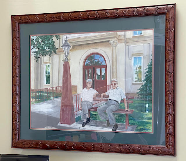 Artist Cora Renfro drew this classic scene of men sitting on the bench in front of the historic Adair County Courthouse. Buck Perkins is on the left but the man on the right is not known unless a reader might recognize him and send in his name. Cora's painting is hanging in the front office at Barger Insurance on the Square where Susan Loy gave us the details.