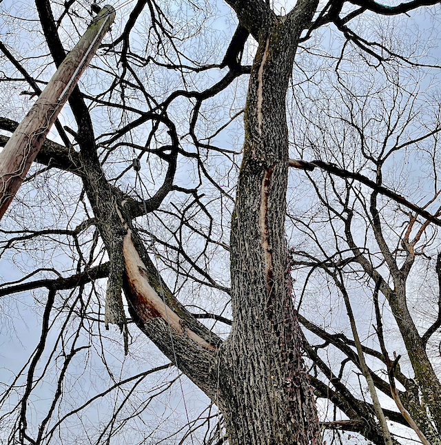 I've been called a tree hugger and it's the honest truth, I hate to loose a single one. However, something happened last summer, taking the life from this beautiful elm, and I need to know what to do to safely remove it from around the electrical wires it is growing beside. All advice is welcome, just click 'comment' below and share... soon, please. - LW
