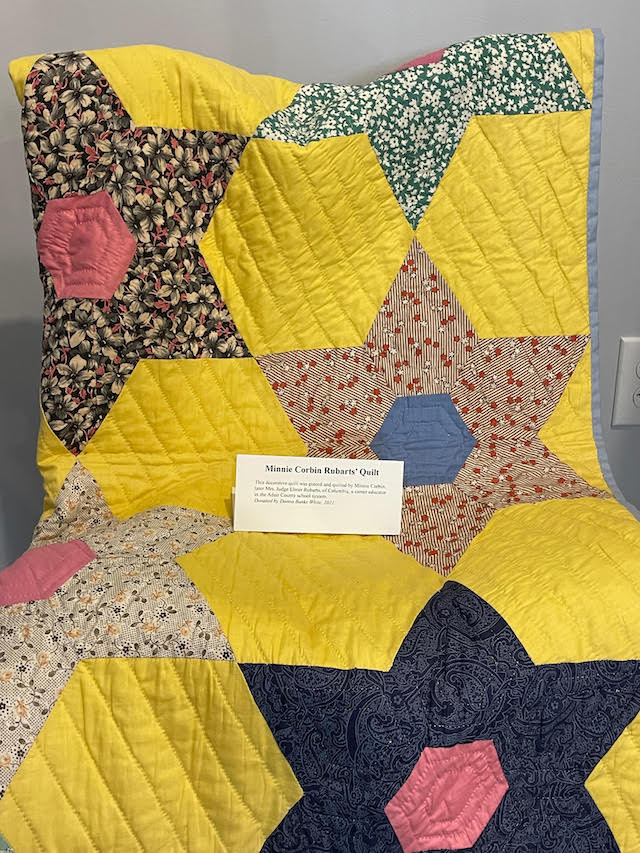 Donna Banks White donated this beautiful quilt on display at the Adair History and Genealogy Center in 2021. The decorative quilt was pieced and quilted by Minnie Corbin, later Mrs. Judge Elmer Rubarts, of Columbia, a career educator in the Adair County school system. Hopefully a reader will know the name of the pattern and share with us by clicking 'comment' below.
